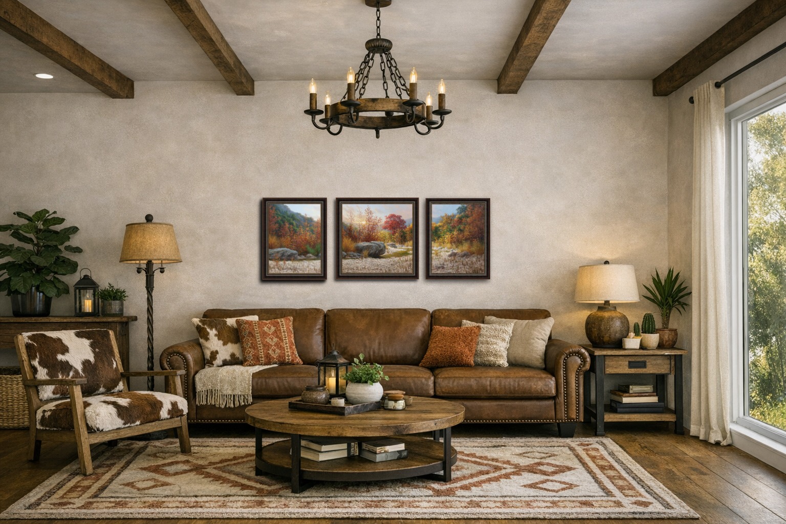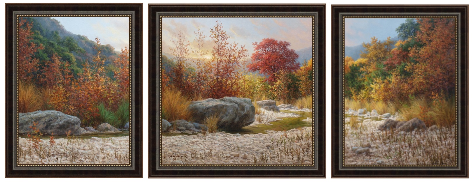 Bring the beauty of Texas autumn into your home with this panoramic three‑panel landscape triptych giclée, a scene filled with warm seasonal light, glowing fall foliage, and the rocky textures of the Hill Country. Each section is a complete composition on its own, yet together they create a sweeping, continuous view that flows naturally across all three panels.