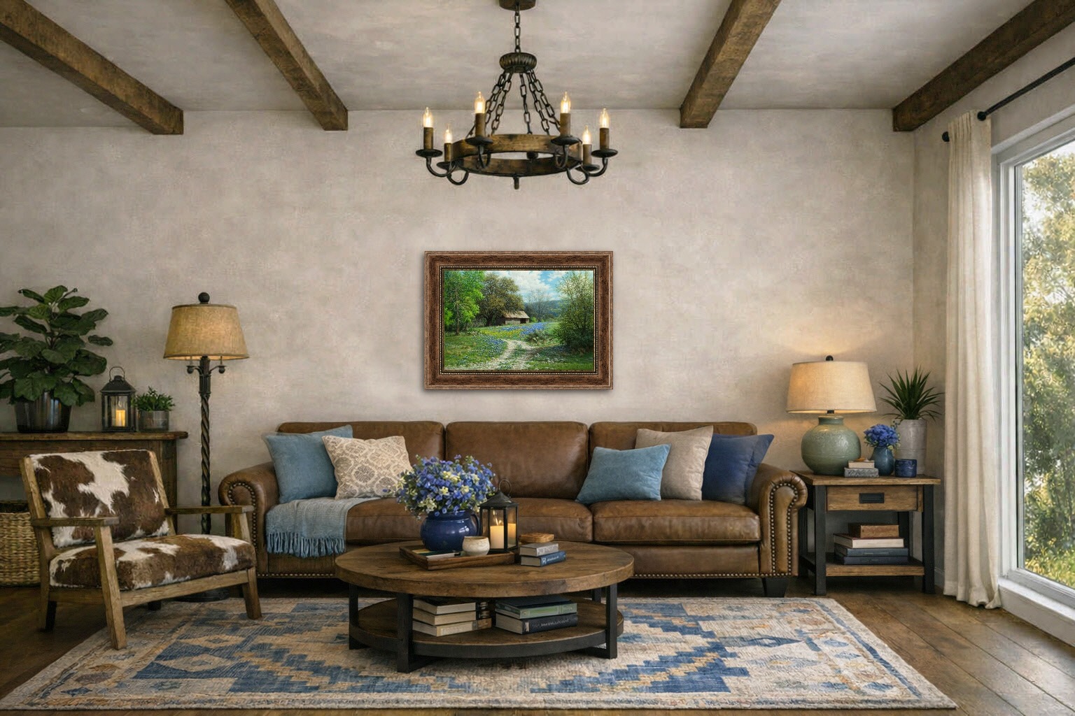 This fine art giclée of Ideal Country captures a peaceful bluebonnet landscape painting with a rustic Texas barn, large oak trees, and a winding dirt path under a bright spring sky. It’s a timeless Hill Country scene that brings warmth and familiarity to any room.